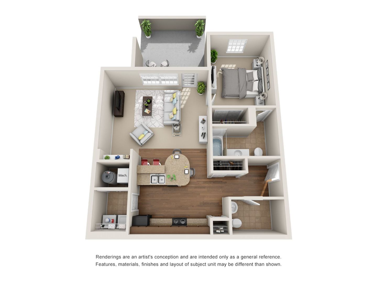 Charming and spacious living area with 9-foot ceilings throughout. Espresso colored cabinets and black appliances in the kitchen give a sleek ambiance. Ample space in bedrooms; great for large furniture.